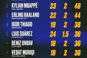 欧洲金靴积分榜:凯恩62分遥遥领先,姆巴佩46分,哈兰德44分